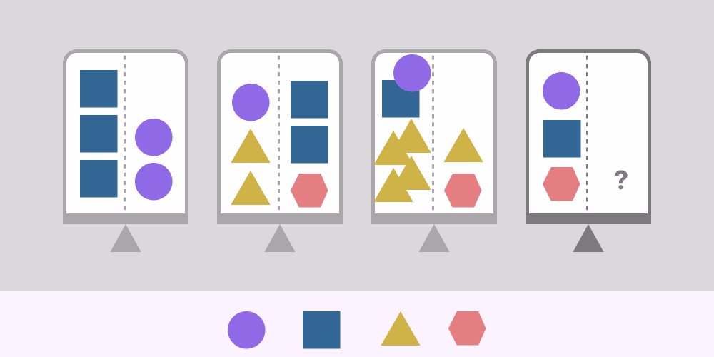 By analyzing the data in the scales to the left, you will need to fill in the shapes to balance the scale to the right.
